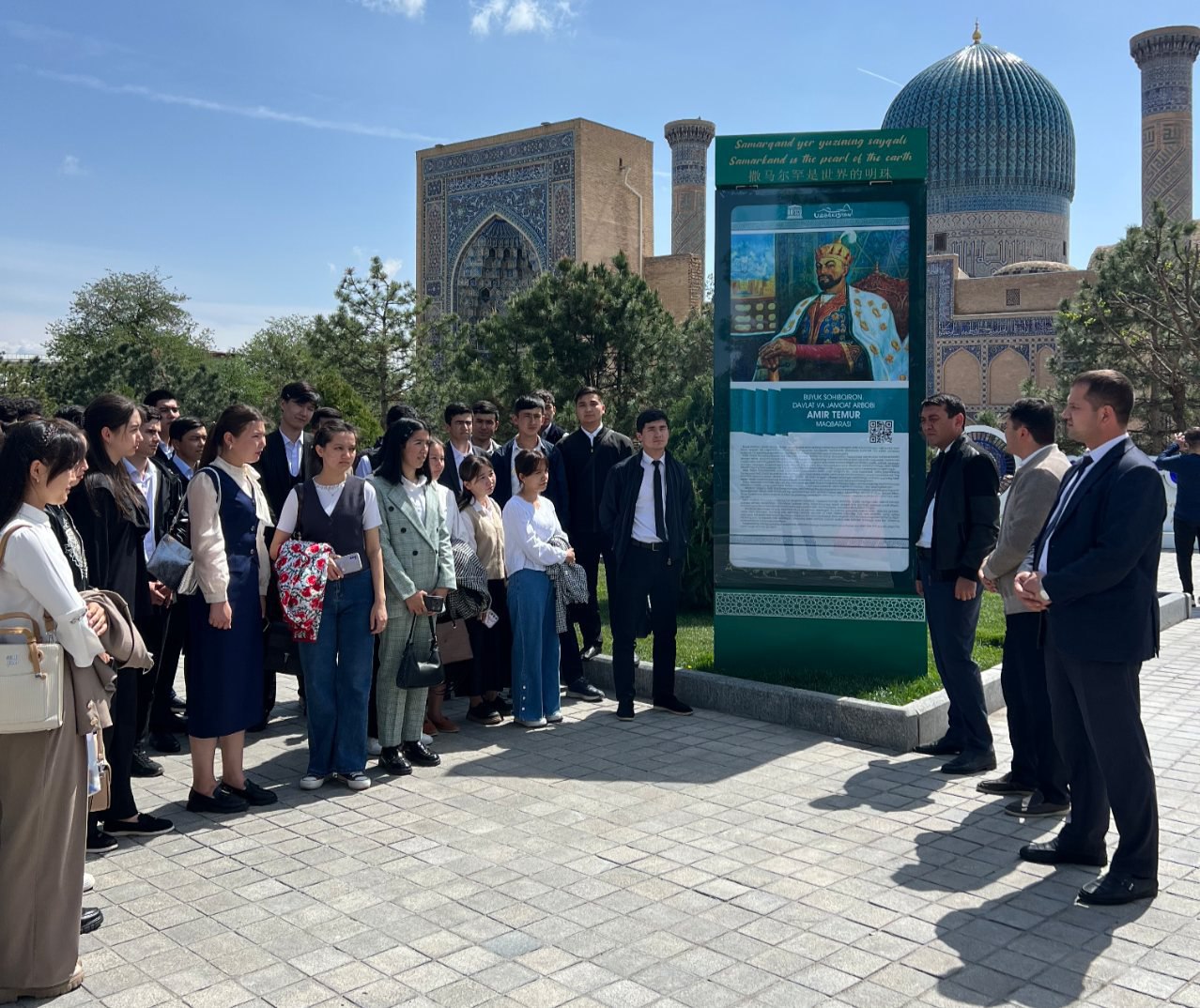 Sayohat davomida ishtirokchilar buyuk sarkarda va davlat arbobi Amir Temur haykali hamda Go‘ri Amir maqbarasini ziyorat qilishdi. Ushbu tarixiy obidalar bilan tanishish talabalarda tarixiy xotira, milliy qadriyatlarga hurmat va yurtga sadoqat tuyg‘ularini mustahkamladi.