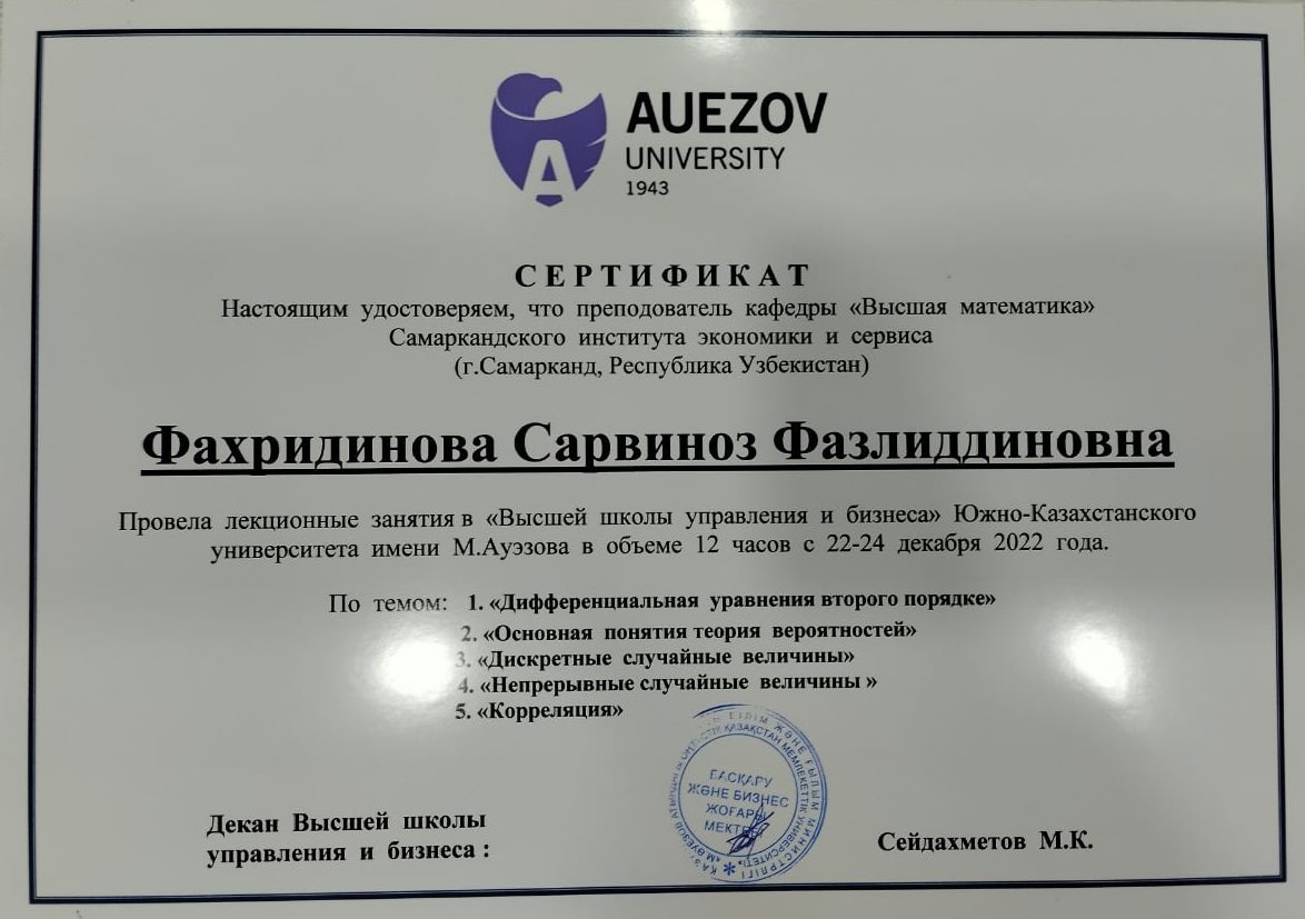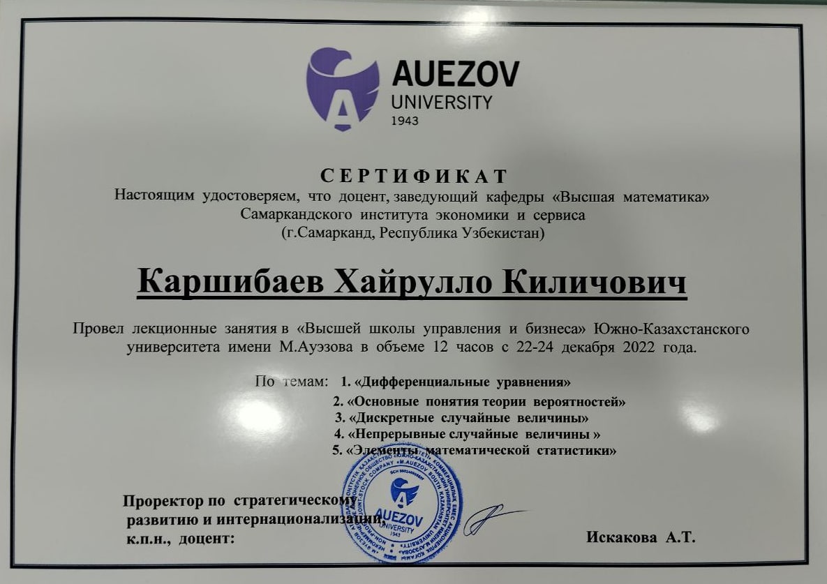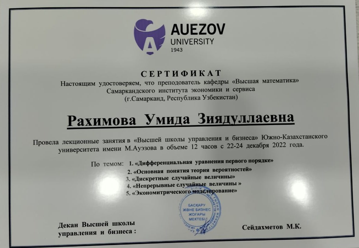 Samarqand iqtisodiyot va servis instituti va Janubiy Qozog'iston M.Avezov nomidagi Universiteti o'rtasida akademik almashuv munosabati bilan institutimiz "Oliy matematika" kafedrasining bir guruh o'qituvchilari Janubiy Qozog'iston M.Avezov nomidagi Universitetiga joriy yilning 21-24- dekabr kunlari tashrif buyurishdi.
