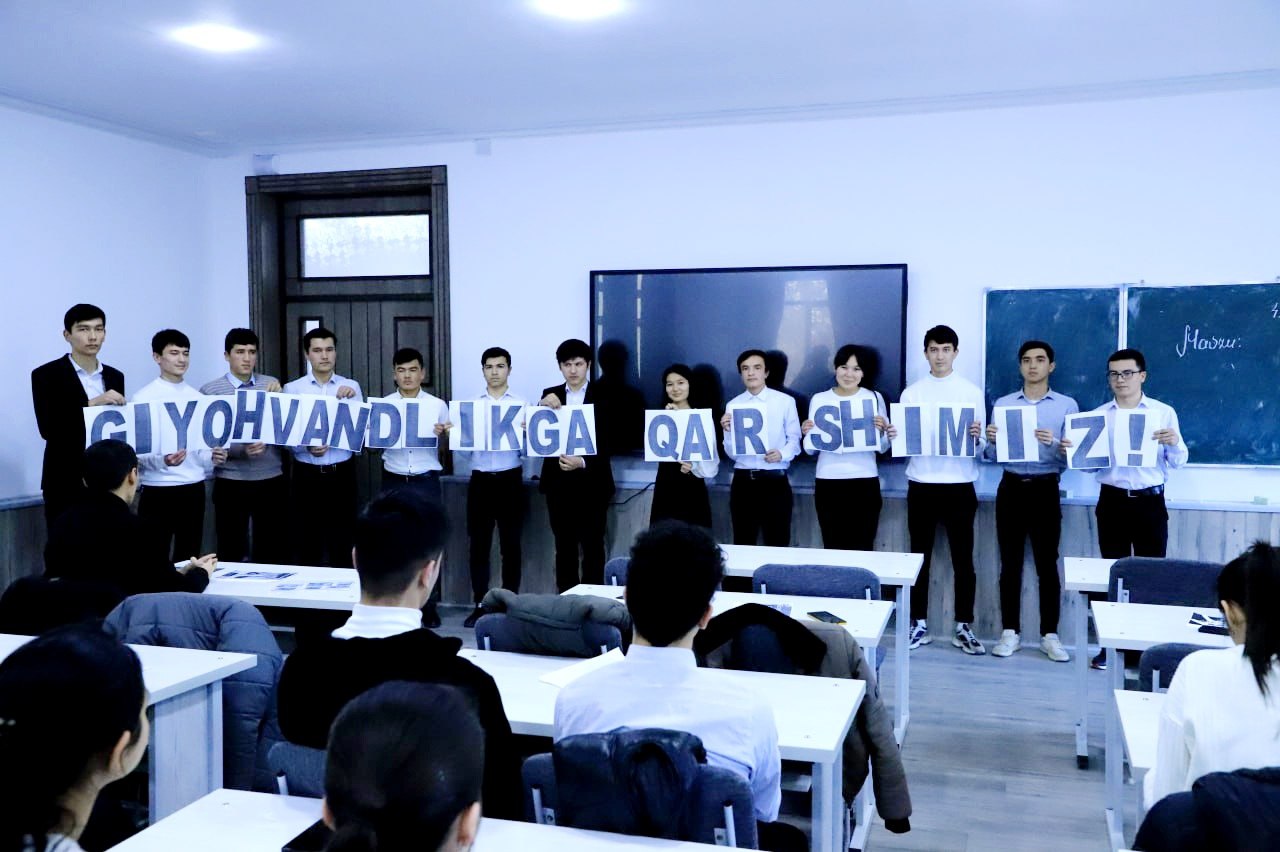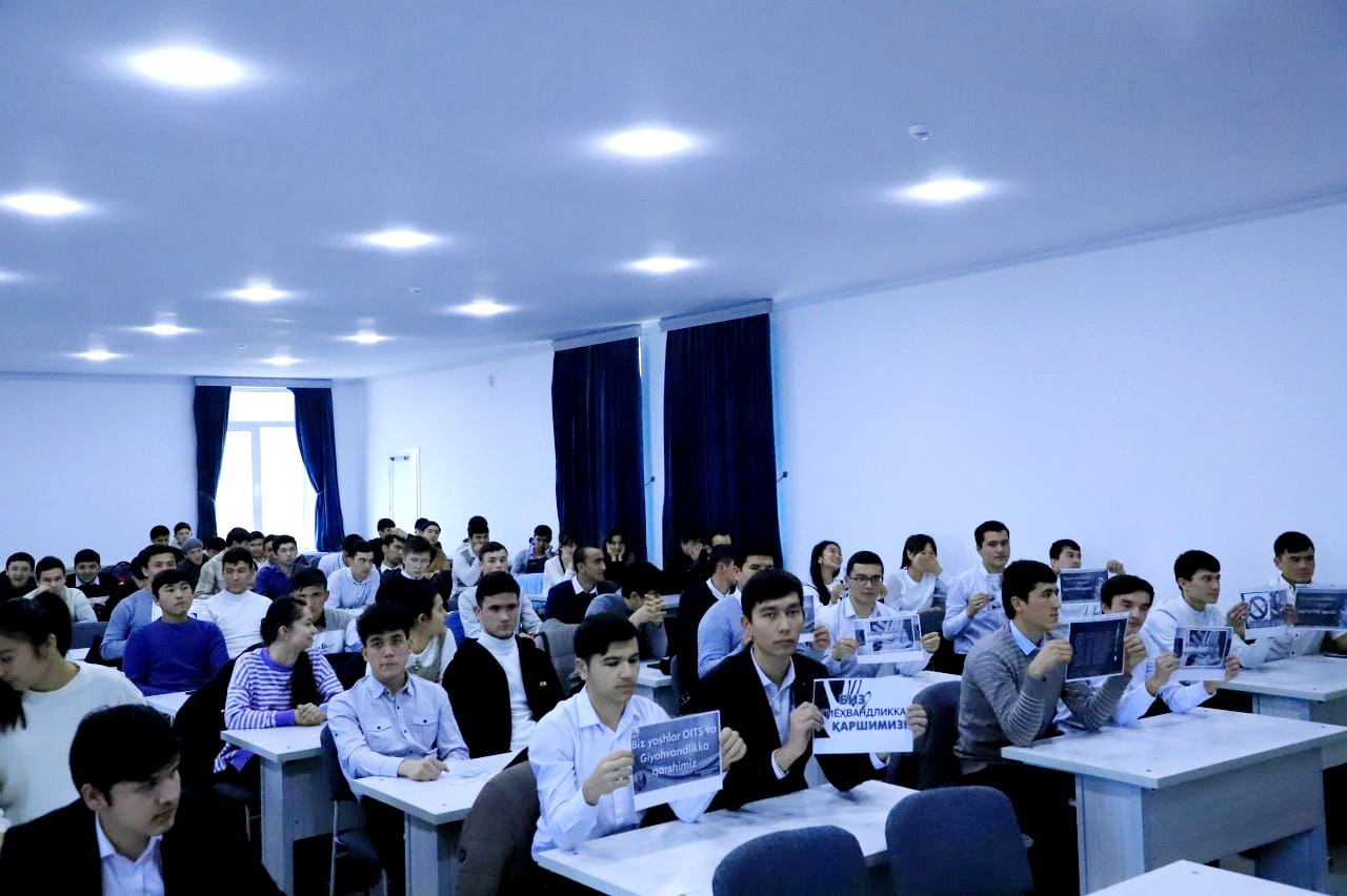 Joriy yilning 4-fevral kuni Iqtisodiyot fakulteti talabalari o'rtasida “Biz yoshlar giyohvandlikka qarshimiz” mavzusida ma’naviy-ma’rifiy targ'ibot tadbiri o'tkazildi. Tadbirda Yoshlar bilan ishlash, ma’naviyat va ma’rifat bo’limi hamda Jismoniy madaniyat kafedrasi professor-o‘qituvchilari talaba-yoshlarga kerakli ma’lumotlarni berib o'tishdi.