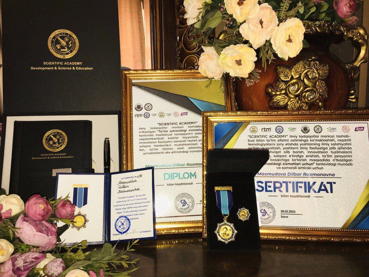 Samarqand iqtisodiyot va servis institutining "Menejment" ixtisosligi bo'yicha 3-bosqich tayanch doktoranti Maxmudova Dilbar Raxmonovna ta'lim sifatini oshirishga ko'maklashish, raqamli texnologiyalarni joriy etish va innovatsion tuzilmalarni shakllantirish, xalqaro e'tirofga erishish, ta'lim jarayonini yangi sifat bosqichiga ko'tarish maqsadida ilmiy-ijodiy izlanishlari, istiqbolli va zamonaviy bilim ulashish borasidagi sa'y-harakatlari, ilmiy va innovatsion faoliyatni samarali tashkil etish va xalqaro hamkorlikni mustahkamlash maqsadida fan, ta'lim tizimini isloh qilishning ustuvor yo'nalishlarini aks ettirishdagi xizmatlari hamda ta'lim jarayonidagi umumiy masalalar bo'yicha samarali takliflari yoritilgan loyihalari bilan — MDH miqyosida tashkil etilgan xalqaro ilmiy-amaliy koʻrik tanlovida ishtirok etib, "Ta'lim sohasidagi xizmatlari uchun" esdalik nishoni, guvohnoma, diplom, sertifikat hamda qimmatbaho sovg'alar bilan taqdirlandi.