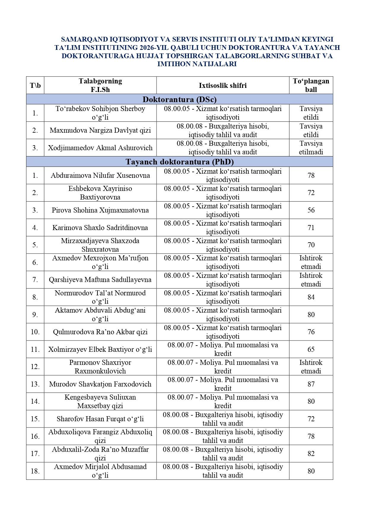 DOKTORANTURA VA TAYANCH DOKTORANTURA IMTIHON NATIJALARI E'LON QILINDI